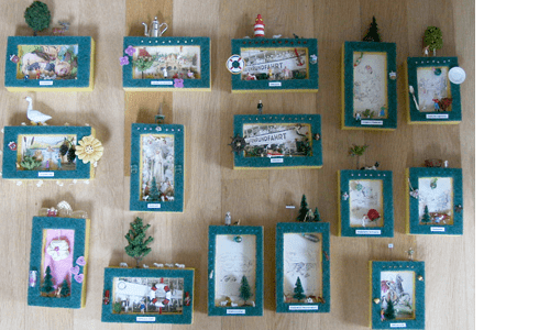 Auf meinen Schwammbühnen inszeniere ich Alltagszenen – mit Spielzeug und Verzierungen aus meinem Fundus alter Kindertage. Alle Schwämmchen werden beschnitten, benäht und beklebt.